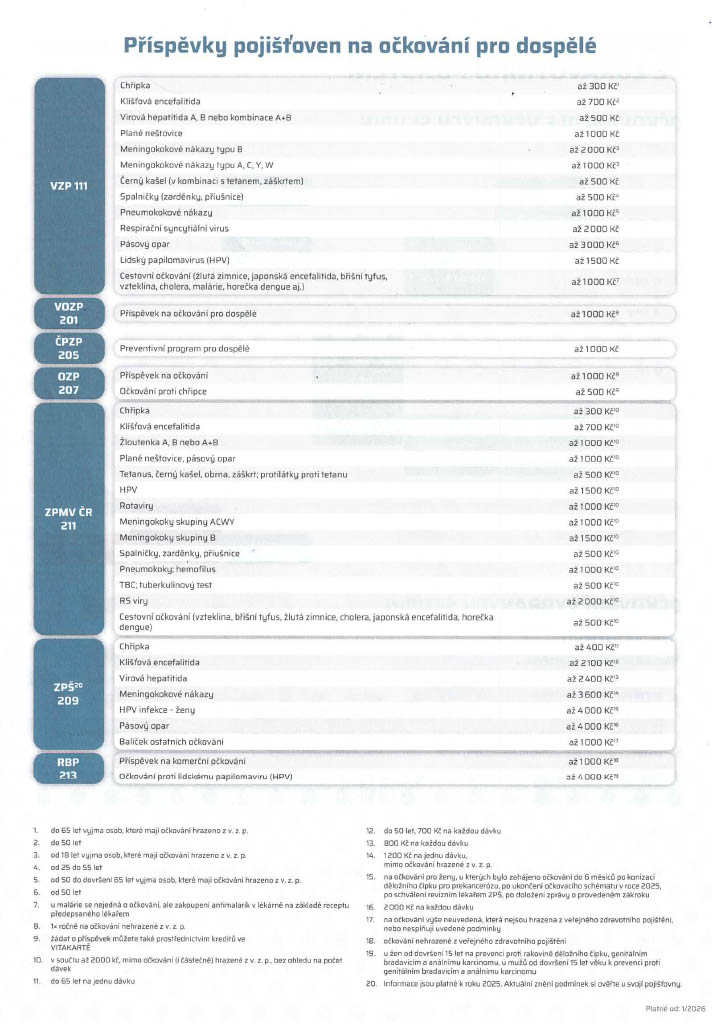 V příloze naleznete přehled, kolik Vám Vaše pojišťovna přispěje na nepovinná očkování. Po očkování je potřeba na pojišťovnu dodat lékařskou zprávu o provedeném očkování a účtenku za vakcínu. Přesný návod, jak postupovat, najdete na webu Vaší zdravotní pojišťovny.